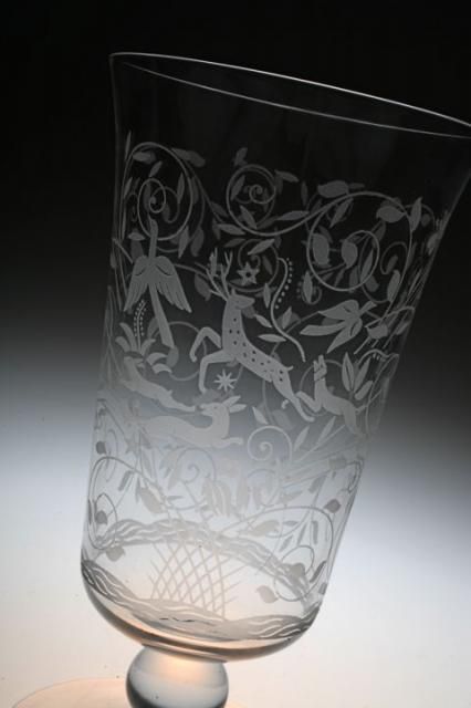 バカラの"Jeddah "ジェッダ。レイラのステム短い方です。 サウジアラビアのとある都市の名前です。 バカラのアールデコのデザイナージョルジュシュヴァリエ デザインのこの柄はトナカイ、キツネ、ウサギ、イヌ、鳥×4、トンボ×2、カタツムリ×2。 が描かれていてとても楽しいグラスです 1945年〜の後期アールデコのグラスです。 高さ138mm口径75mm容量180/250ml