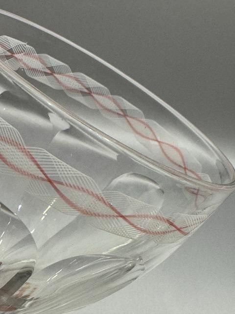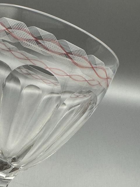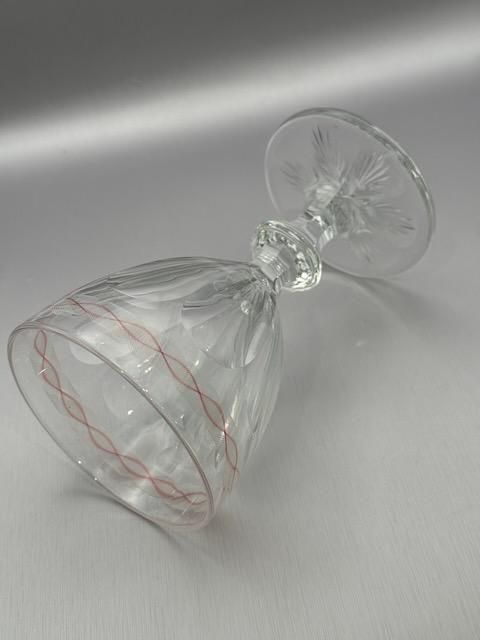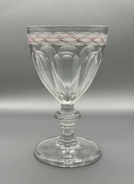 Baccaratの代表的なグラスシリーズのHARCOURTの起源は、1825年にアルクール公爵家の婚礼を機に原型が誕生し、その後1841年に現行デザインで正式発表されたとされています。ナポレオン3世の時代からエリゼ宮を含むヨーロッパの要人の食卓を飾り、世界的に格式高いグラスとして教皇ヨハネ・パウロ2世、タイ国王、モロッコ王などにも愛用されてきた歴史のグラスです。 このグラスは、19世紀半ばに流行した装飾ガラスの芸術性を象徴する作品であり、バカラの技術力が絶頂にあった時代の代表例です。特にこのようなピンクとオパール色を使ったエナメル細工は、当時のヨーロッパ貴族の間で非常に人気がありました。1855年のパリ万博に出品されており、国際的な舞台で評価された歴史的作品でもあります。 1850年代 高さ15.5cm 口径9.5cm 容量満水300ml
