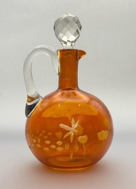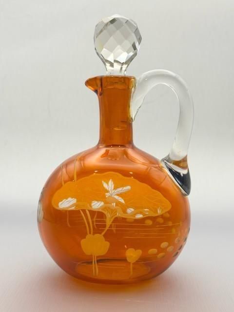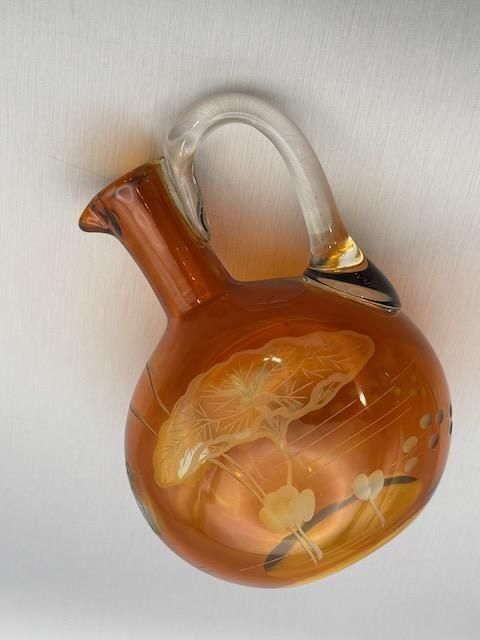 バカラ1880年代のジャポネスクのデキャンタピッチャー。濃いめのオレンジの被せガラスの片面に大きな蓮の葉がグラビュールされていて、裏面は水面にトンボが飛んでる柄が葉を通して透けて見えるようになっています。フランス人が、日本文化を見様見真似で作ったジャポネスクの時代は面白いデザインの宝庫です。 1880年代 高さ13cm 容量満水280ml