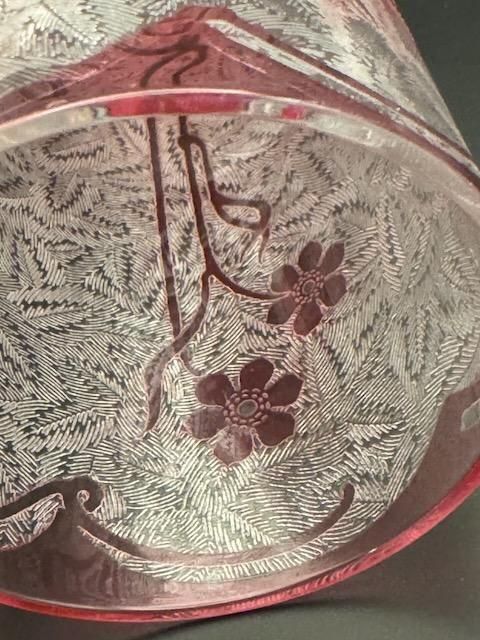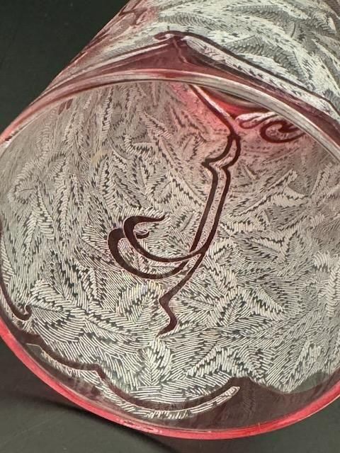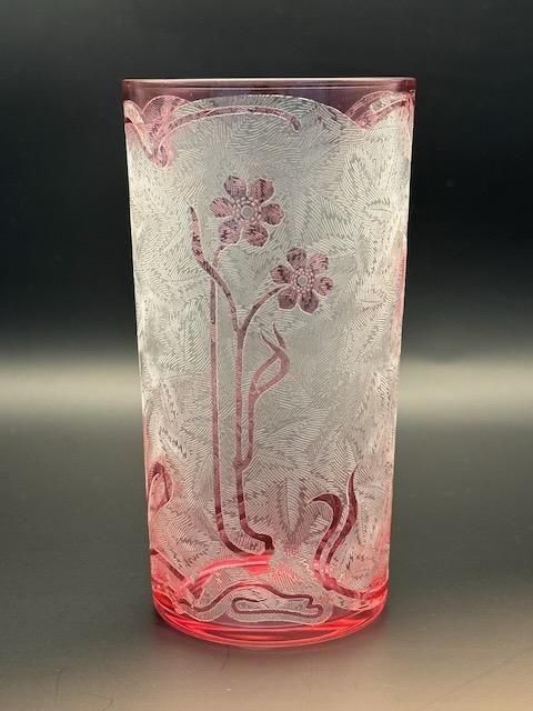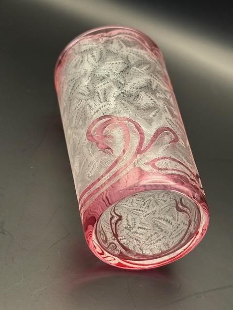 バカラ、1880-1900年代のエグランチエ・シリーズのピンクの被せガラスにアシッドエッチングのタンブラー。このサイズは珍しいです。 高さ12cm口径6.2cm容量満水270ml